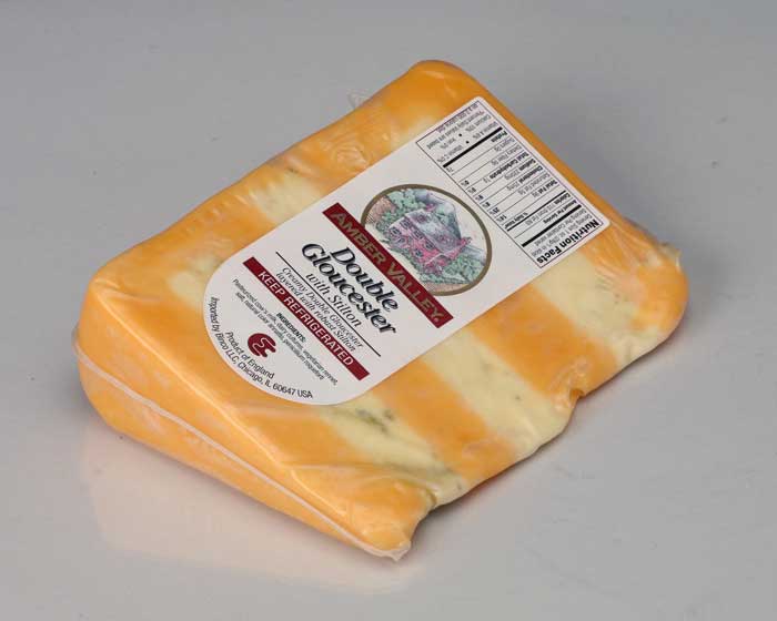 A layered cheese of mild Double Gloucester and Blue Stilton. Made with pasteurized cow milk. Beautiful flavor profile with cheddar flavor and the zesty tang of Stilton.